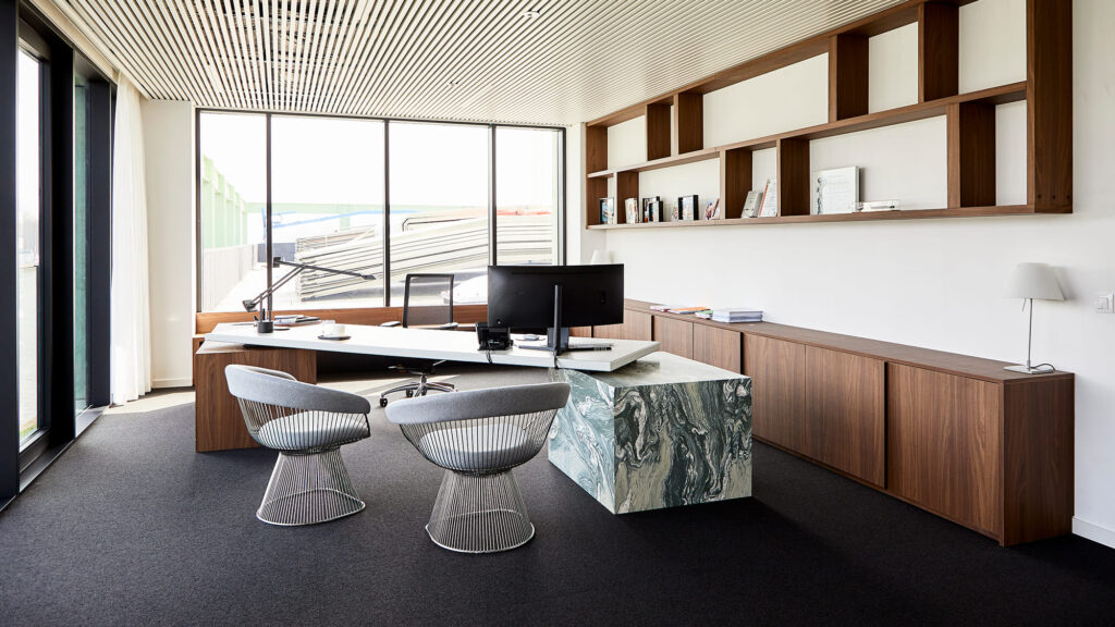 Door het bekleden van muren en betonnen elementen gaven we het kantoorgebouw van Blommaert een warme en elegante uitstraling. Daarnaast ontwierpen we een exclusief marmeren ladeblok voor het directiekantoor, dat de verfijnde uitstraling verder versterkt. Het geheel werkten we af met ergonomische bureaustoelen van Wagner.