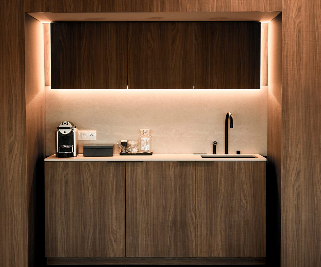 Van het bekleden van constructieve betonnen elementen over een maatwerkkeuken tot zitelementen boven de verwarming: Benofice creëerde een volledige kantoorinrichting op maat voor Blommaert in Wijnegem.